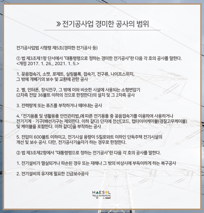 전기공사업 면허는 위와 같이 전력, 전기, 신에너지 및 재생에너지 설비 등을 설치하고 유지보수