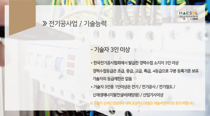 1인 이상은 전기/전기공사/전기철도/신재생에너지발전설비(태양광) 산업기사 이상의 자격을 갖추어야