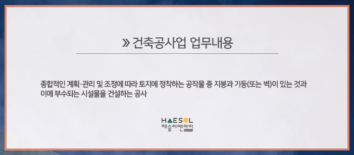 있는 것과 이에 부수되는 시설물을 건설하는 공사로, 건설산업기본법을 따르고 있는 종합 시공 사업입니다.