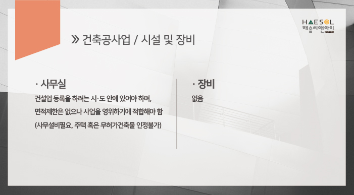 건축공사업은 별도의 특수 장비 규정이 없는 업종으로, 시설로써 사무실을 요건에 맞게 잘 갖추어