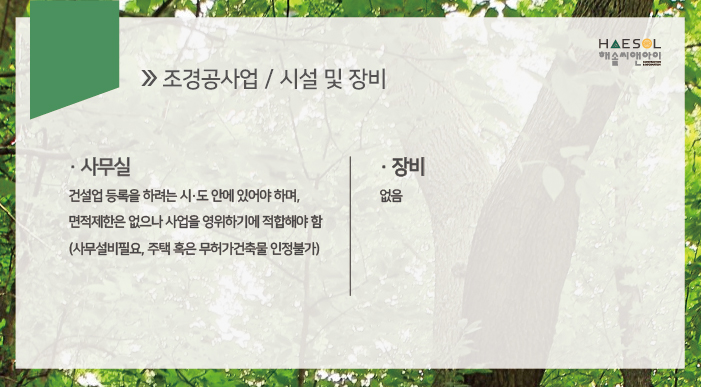 조경공사업의 경우 특수 장비에 대한 별도의 규정이 없는 업종 중 하나이므로 시설로서 사무실을