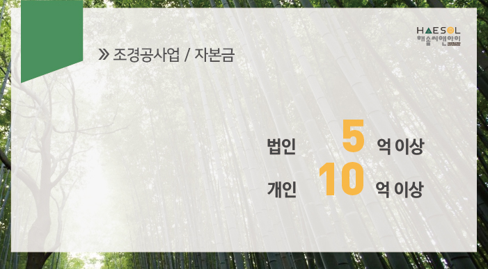 조경공사업 면허 취득을 위한 자본금은 법인 5억원 이상, 개인사업자는 10억원 이상으로 규정되어