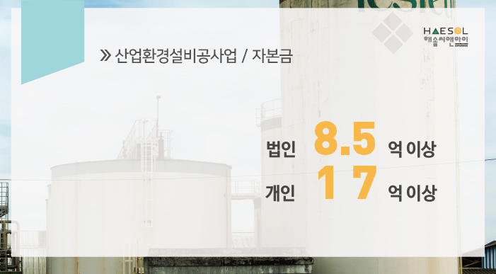 산업환경설비공사업 면허 취득을 위해 보유해야 할 자본금은 법인 8억 5천만원 이상, 개인 17억원 이상