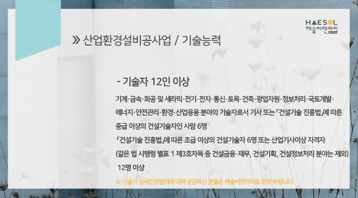 위 요건 숙지하시어 기술자를 충원하시고, 이 외 상세인정범위에 대하여 궁금한 사항은 해솔씨앤아이로