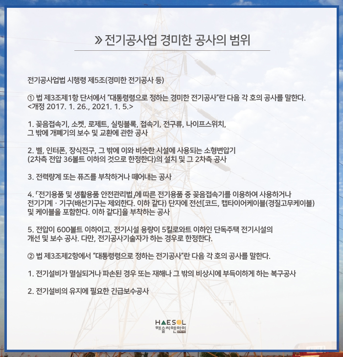 전기공사면허는 전력, 전기, 신에너지 및 재생에너지 설비 등을 설치.유지.보수하는 공사 및 이에 따른