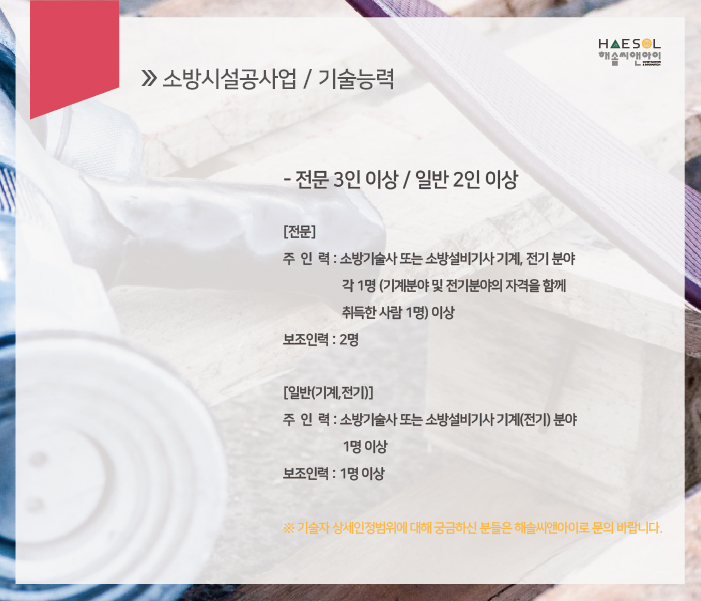 소방시설공사업의 경우 전문분야와 일반분야에 규정되어있는 해당 자격을 갖춘 기술자가 보유가