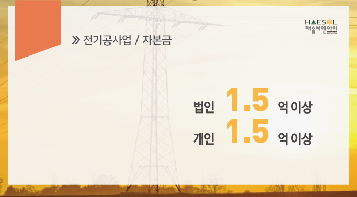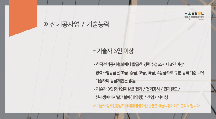 이 때, 기술자 3인 중 1인 이상은 전기, 전기공사, 전기철도, 신재생에너지발전설비(태양광)