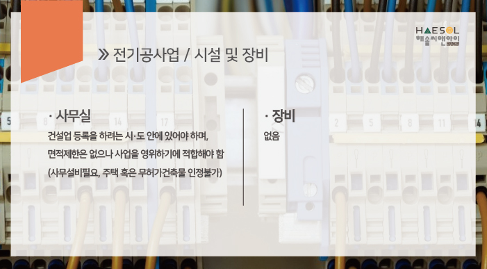 마지막으로 갖추어야 할 등록기준은 시설로서, 전기공사업 면허 등록을 하려는 시.도 내에 사무실을