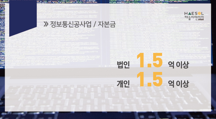 정보통신공사업 면허 등록을 하기 위해서 준비되어야 하는 자본금은 법인 및 개인사업자 동일한 1억 5천만원 이상입니다.