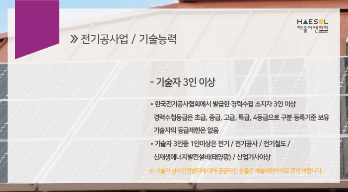 기술자는 모두 한국전기공사협회에서 발급한 경력수첩 소지자로서, 기술자 3인 중 1인 이상은 전기/ 전기공사/ 전기철도/ 신재생에너지발전설비(태양광) 산업기사 이상의 자격을 함께 갖추어야 합니다.
