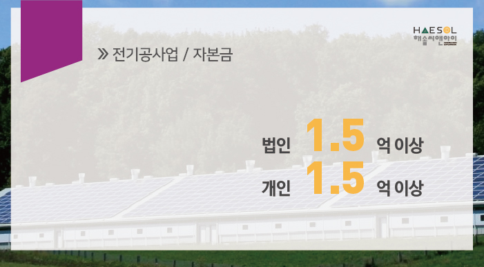 법인사업자의 경우라면 이와 더불어 등기부등본상의 납입자본금 역시 등록기준 이상이 되어야 하므로 필요 시 추가적인 증자 업무를 통해 이를 충족해주셔야 하겠습니다. (사업목적란에는 전기공사업 명시)