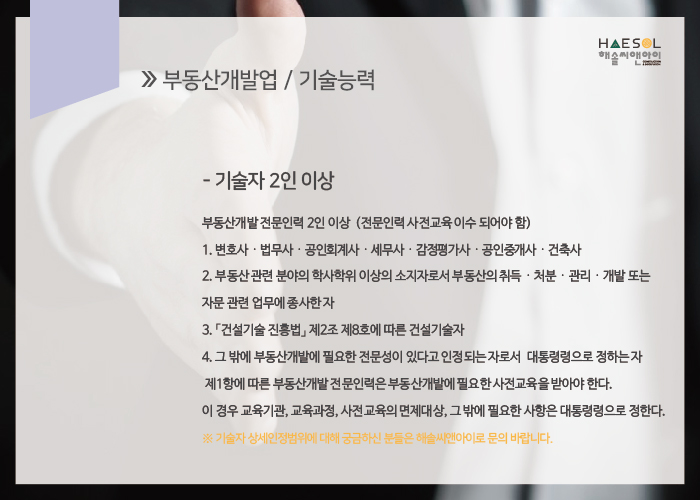 기술자가 갖추어야 할 자격 요건은, 부동산개발 전문인력 2인 이상으로 전문인력 사전교육을 이수해야 합니다.