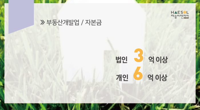 부동산개발업 면허 등록을 위해서는 법인 3억원 이상, 개인사업자는 6억원 이상의 자본금이 준비되어야 합니다.
