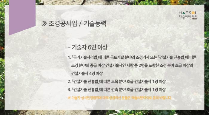 기술자는, 국가기술자격법에 따른 국토개발 분야의 조경기사 또는 한국건설기술인협회에서 발급하는 조경분야 중급 이상의 경력수첩 보유자 중 2인을 포함한 조경분야 초급 이상의 경력수첩 보유자 4인 이상으로 구성되어야 하며, 모두 우리 회사에만 소속되어 상시 근무하는 임직원으로써 타사 겸업이나 겸직은 불가하며, 사업장의 4대보험 가입 또한 완료처리 되어있어야 합니다.