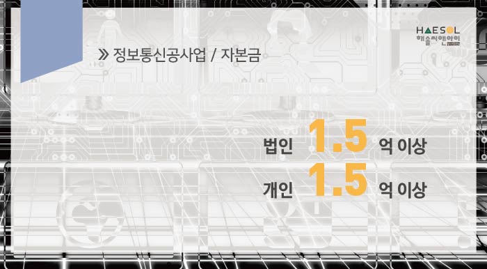 정보통신공사업 면허 취득을 위한 자본금 1억 5천만원 이상이 필요합니다.