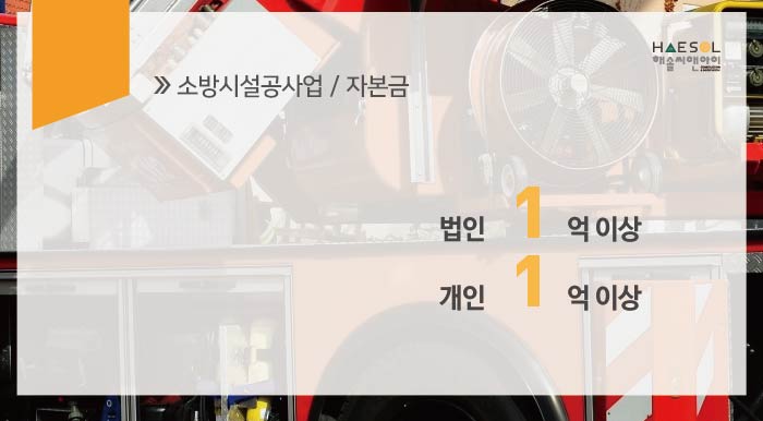 소방시설공사업 등록을 위한 자본금은 법인,개인사업자 그리고 분야에 관계 없이 1억원 이상으로 규정되어있습니다.
