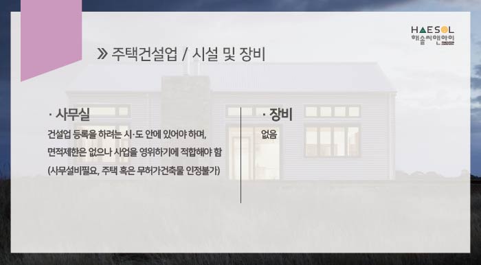 주택건설업면허의 시설 요건으로는, 면허 등록을 하려는 시·도 내에 사무실을 갖추어 사업을 운영 할 환경을 조성하도록 합니다.
