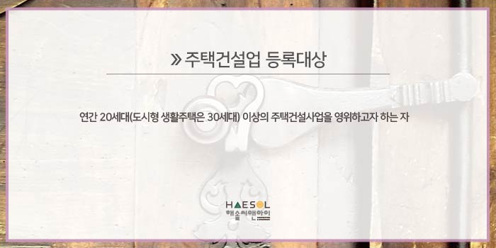 주택건설업 면허의 등록 대상은, 연간 20세대 (도시형 생활주택은 30세대) 이상의 주택건설사업을 영위하고자 하는 자로 주택을 임대하거나 분양을 실시하기 위한 시행을 하고자 한다면 반드시 면허 등록이 필요합니다. (단, 주택 외 상가나 기타용도의 건축물일 경우 주택건설업 면허가 아닌 부동산개발업 면허의 등록이 필요함)