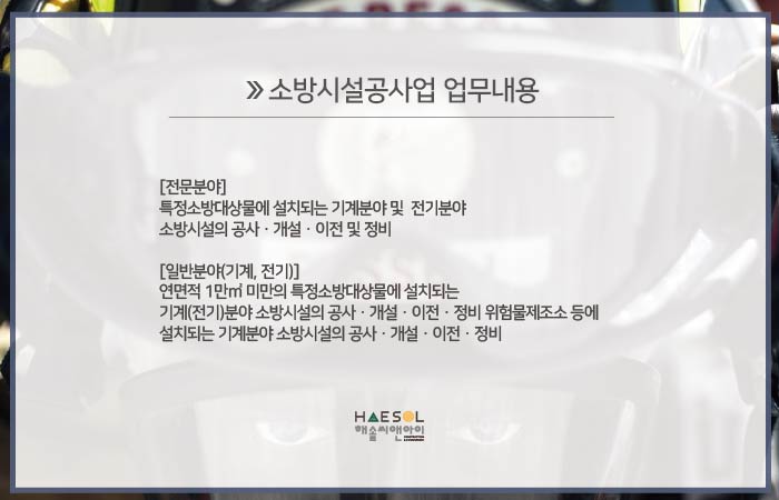 소방시설공사업은 특정 소방대상물에 설치되는 기계분야 및 전기분야의 소방시설의 공사, 개설, 이전 및 정비를 전문으로 하는 사업입니다.
