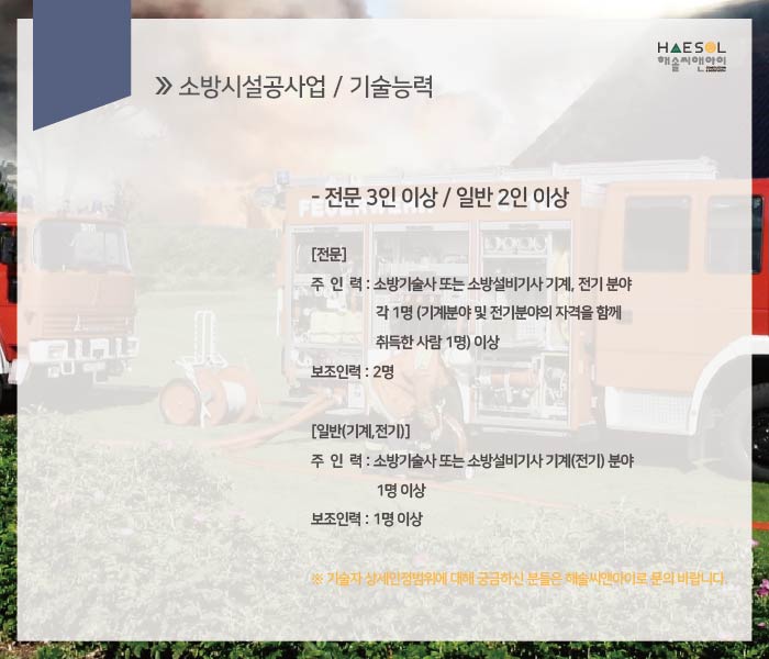 전기분야 : 소방기술사 또는 소방설비기사 (전기분야) 1인과 전기분야 보조인력 1인입니다.