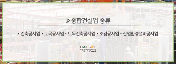 종합건설업은, 종합적인 계획과 관리 및 조정에 따라 시설물 등을 건설하는 공사업으로 업무 범위와 내용에 따라 위와 같이 건축공사업, 토목공사업, 토목건축공사업, 산업환경설비공사업, 조경공사업으로 분류되어있습니다.