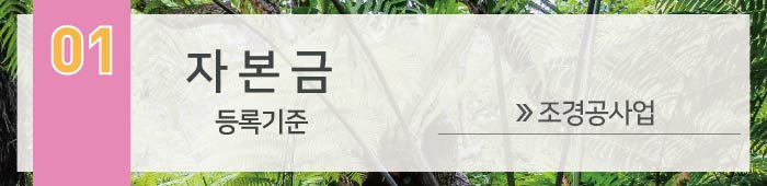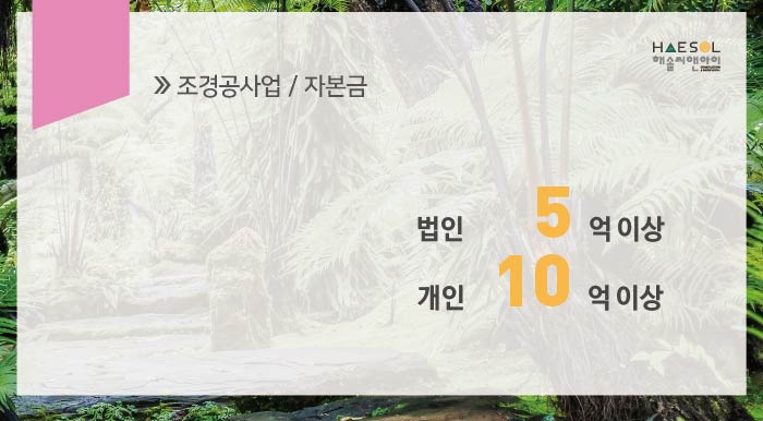 조경공사업 면허 등록을 위해서는 법인 5억 이상, 개인 10억 이상의 자본금이 필요합니다.