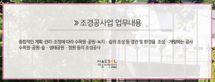 조경공사업은 종합적인 계획, 관리, 조정에 따라 수목원·공원·녹지·숲의 조성 등 경관 및 환경을 조성·개량하는 공사로 이러한 공사업 영위에 앞서 건설산업기본법에 의거하여 공사예정금액이 5,000만원 이상일 경우 반드시 면허 등록을 하셔야 합니다.