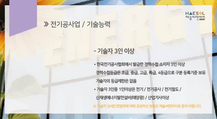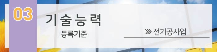 전기공사업 기술능력 기준으로는 3인 이상의 기술자를 보유해야 합니다.