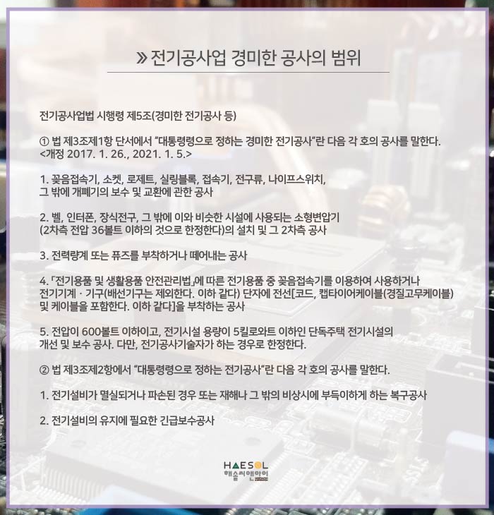 전기공사업은 전력, 전기, 신에너지 및 재생에너지 설비 등을 설치하고 유지, 보수하는 공사를 하기 위해서 취득해야 하며, 경미한 공사에 한하여 면허 없이도 공사 진행이 가능하나, 경미한 공사의 경우에는 매우 작은 규모이기 떄문에 실질적인 공사업 영위를 위해서는 면허 등록이 필요합니다.