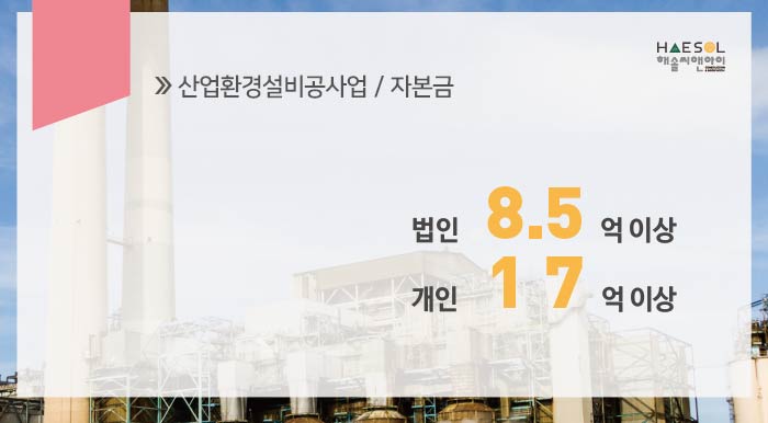 산업환경설비공사업 면허 등록기준을 충족하기 위한 자본금의 기준은 법인과 개인사업자 모두 동일하지만 이 때 준비되는 자본금은 건설업 운영을 목적으로 한 건설업 실질자본금으로써 준비가 되어야 합니다.