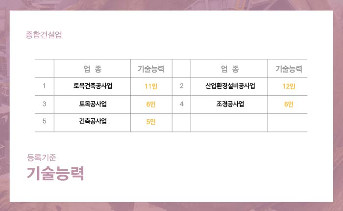 종합건설면허 기술능력 등록기준 충족을 위해서는 업종별로 규정된 자격을 갖춘 기술자 보유가 필요합니다.