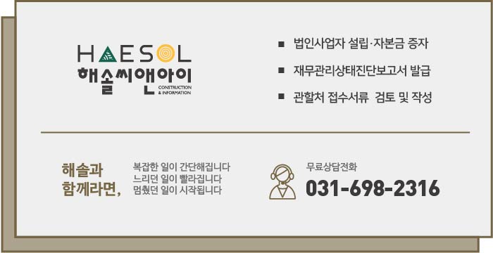 회사의 설립 시기나 형태, 겸업사업 여부, 자본금이 필요한 다른 면허의 보유 유무 등과 같이 회사가 처해진 여러 제반상황에 따라 자본금 준비 과정에 차이가 있게 되므로 해솔씨앤아이와 같은 건설경영 전문가와 함께 실질자본금에 대한 전문 지식을 바탕으로 준비하시는 것을 권장드립니다.
