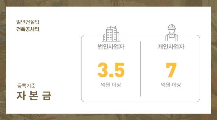 자본금 법인은 3억 5천만원 이상, 개인사업자는 7억 이상이 준비되어야 건축공사업 면허 등록이 가능하게 됩니다.