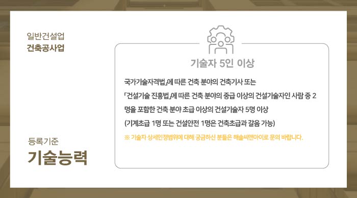 기술능력 기준으로는, 건축공사업에 규정된 자격을 갖춘 기술자 5인 이상을 보유해야 합니다.
