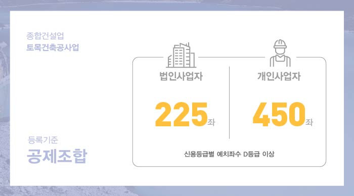 토목건축공사업 면허 등록을 위한 자본금 법인 8억 5천만원 이상, 개인사업자 17억 이상의 준비가 필요합니다.