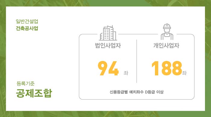 이에 따라 건축공사업은 건설공제조합에 일정 금액을 출자 예치한 후 보증가능금액확인서를 발급받아 면허 신청 시 제출하셔야 하는데, 예치되어야 할 출자 금액은 공제조합 내에서 자체적으로 실시하는 신용평가 결과 등급과 예치 시기에 따라 조금씩 상이하나, 신규로 면허를 등록하는 경우라면 기존에 별도로 평가받을 실적이 존재하지 않기때문에 통상적으로 최대좌수에 해당하는 금액을 예치하게된다고 보시면 됩니다. (법인 94좌, 개인 188좌) 2024년 4월 현재 시점 기준 건설공제조합 1좌당 금액은 1,541,000원입니다.