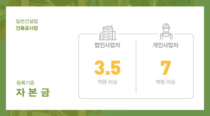 건축공사업 면허 등록을 위해서는 법인 3억 5천만원 이상, 개인사업자 7억원 이상이 필요합니다.