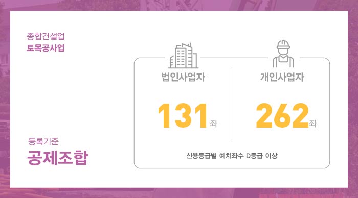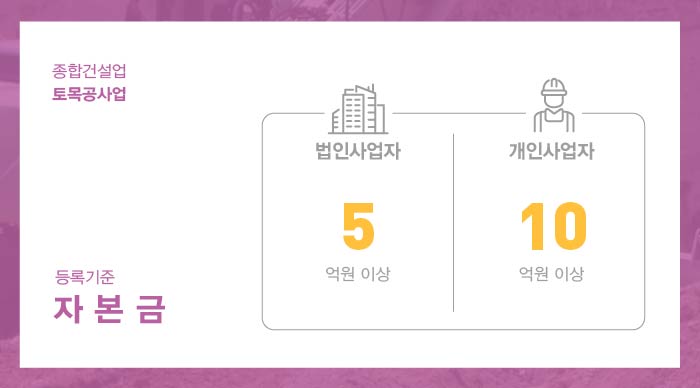 토목공사업 면허 취득을 위해서는 자본금 법인사업자 5억이상, 개인사업자 10억 이상을 준비해야 합니다.