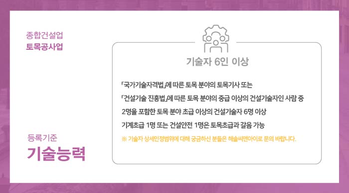 기술자는 국가기술자격법에 따른 토목 분야의 토목기사 또는 한국건설기술인협회에서 발급하는 토목 분야 중급 이상의 경력수첩 보유자 중 2인을 포함한 토목 분야 초급 이상의 경력수첩 보유자 6인 이상으로 구성되어야 하며, 상시 근로가 원칙이므로 타사 겸업 및 겸직은 불가합니다.