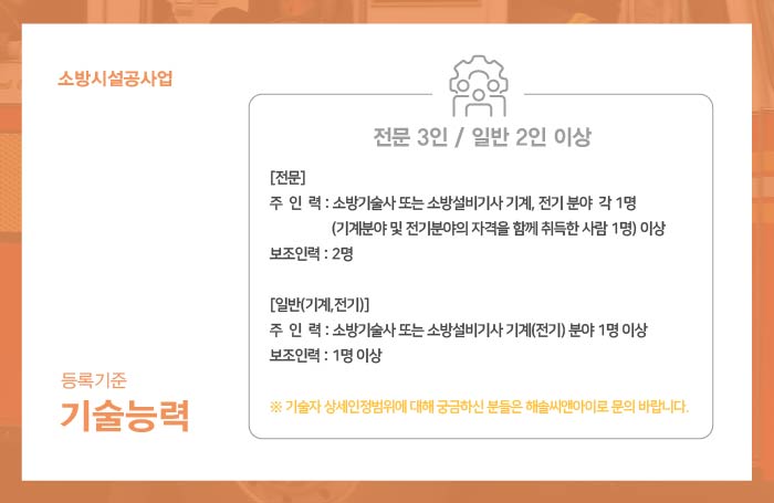 소방시설공사업은 전문분야와 일반분야에 규정되어있는 자격 요건을 갖춘 기술자를 보유해야 합니다.