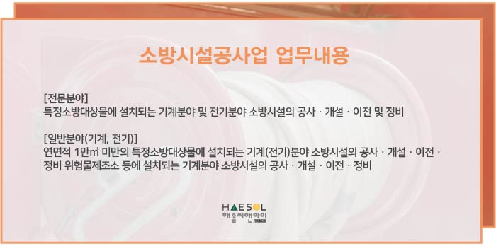 소방시설공사업은 특정 소방대상물에 설치되는 기계분야 및 전기분야의 소방시설의 공사, 개설, 이전 및 정비를 전문으로 하는 사업입니다.
