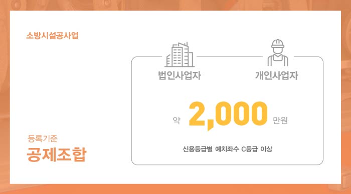 소방시설공사업의 경우 소방산업공제조합에 약 2,000만원 가량의 출자금 예치가 필요합니다.