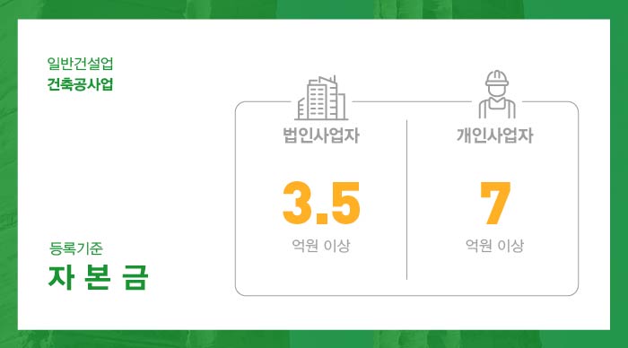 자본금 법인 3억 5천만원 이상, 개인사업자 7억원 이상 준비해야 건축공사업 면허 취득을 하실 수 있게 됩니다.