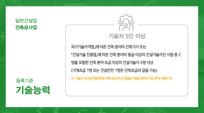 기술능력 기준으로는, 건축공사업에 규정된 자격을 갖춘 기술자 5인 이상을 보유해야 합니다.