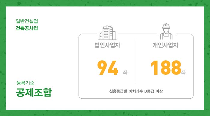 이에 따라 건축공사업은 건설공제조합에 일정 금액을 출자 예치한 후 보증가능금액확인서를 발급받아 면허 신청 시 제출하셔야 하는데, 예치되어야 할 출자 금액은 공제조합 내에서 자체적으로 실시하는 신용평가 결과 등급과 예치 시기에 따라 조금씩 상이하나, 신규로 면허를 등록하는 경우라면 기존에 별도로 평가받을 실적이 존재하지 않기때문에 통상적으로 최대좌수에 해당하는 금액을 예치하게된다고 보시면 됩니다. (법인 94좌, 개인 188좌) 2024년 8월 현재 시점 기준 건설공제조합 1좌당 금액은 1,551,800원입니다.