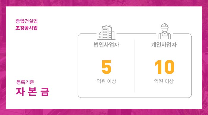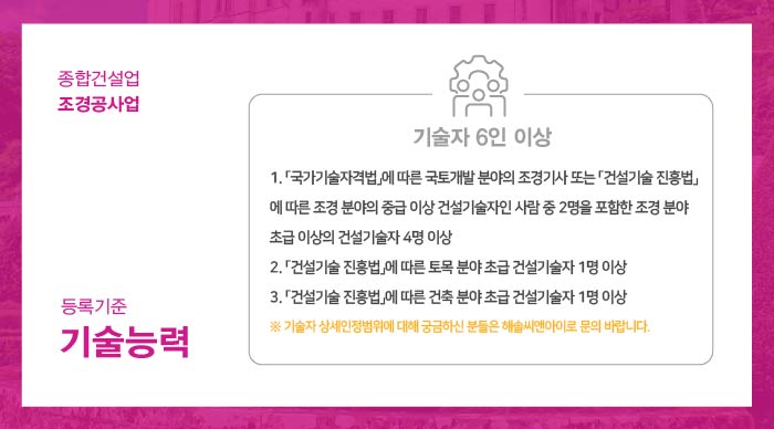 오늘은 종합공사업 중 하나인 조경공사업 면허 준비 시 반드시 알아두어야 하는 필수 내용인 등록기준에 대해 안내드리도록 하겠습니다.