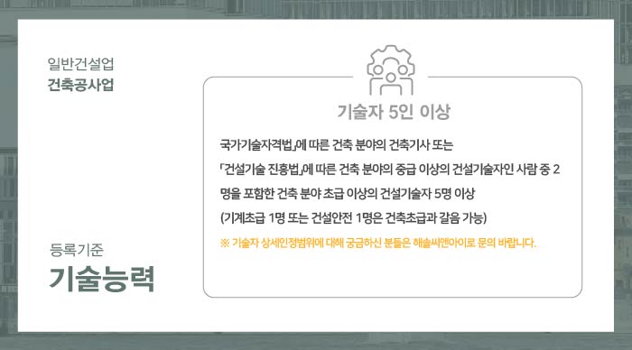 기술능력 기준으로는, 건축공사업에 규정된 자격을 갖춘 기술자 5인 이상을 보유해야 합니다.