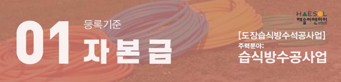 개인사업자와 법인사업자 모두 준비해야하는 실질자본금은 1억 5천만원 이상으로 동일하나 법인사업자는 법인등기부등본상 납입자본금 또한 등록기준 이상을 충족할 수 있도록 준비해야 하며, 사업목적란에 습식방수공사업에 대한 목적을 꼭 기재해주셔야 합니다.