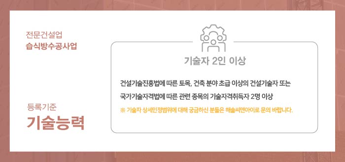 자격요건을 충족하는 기술자 2인 이상이 준비되어야 면허 취득을 진행하실 수 있게 됩니다.