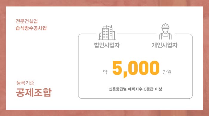 습식방수공사업 면허 등록 진행을 위해 법인과 개인사업자 모두 1억 5천만원 이상의 자본금 준비가 필요합니다.